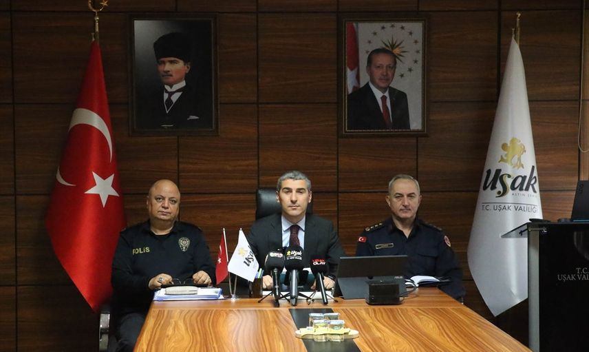 Uşak Valisi Naci Aktaş (ortada) başkanlığında Valilik Toplantı Salonu'nda Güvenlik ve Asayiş Değerlendirme Toplantısı gerçekleştirildi. Aktaş, nisan ayında polis ve jandarma bölgesinde gerçekleşen olaylara ve operasyonlara ilişkin açıklama yaptı. Toplantıya, İl Jandarma Komutanı Kıdemli Albay Fahri Semiz (sağda) ve İl Emniyet Müdürü Mehmet Ali Kolcu (solda) da katıldı.