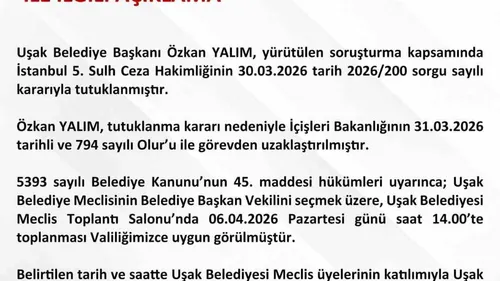 Uşak Valiliği, Belediye Başkanı Özkan Yalım’ın tutuklanıp İçişleri Bakanlığı kararıyla görevden uzaklaştırıldığını, vekil seçiminin 6 Nisan 2026'da gerçekleştirileceğini açıkladı.