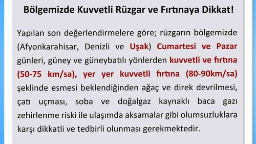 Uşak'ta kuvvetli rüzgar ve fırtına uyarısı Uşak Valiliği ve Uşak Belediyesi, kent genelinde beklenen kuvvetli rüzgar, fırtına ve yağışlara karşı vatandaşları uyardı. Yapılan meteorolojik değerlendirmelere göre rüzgarın Cumartesi ve Pazar günleri güney ve güneybatılı yönlerden kuvvetli ve fırtına şeklinde esmesi…