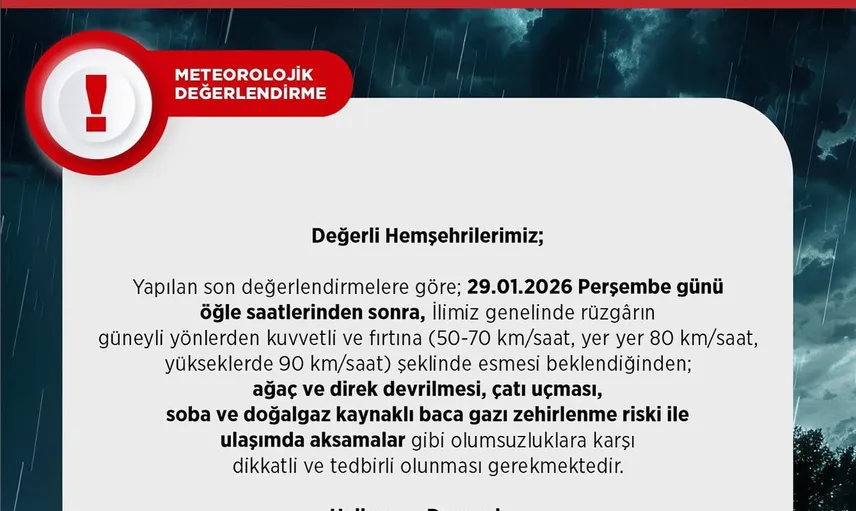 Uşak Valiliği ve Uşak Belediyesi, kent genelinde beklenen kuvvetli rüzgar ve fırtınaya karşı vatandaşları uyardı. Uşak Valiliği tarafından yapılan meteorolojik değerlendirmelere göre; 29 Ocak 2026 Perşembe günü öğle saatlerinden itibaren Afyonkarahisar, Uşak ve Denizli’yi kapsayan bölgede güney ve güneybatılı yönlerden kuvvetli rüzgar ve fırtına bekleniyor.