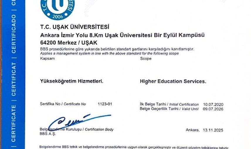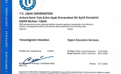UŞAK ÜNİVERSİTESİ, KALİTE VE KURUMSAL YÖNETİM STANDARTLARINI YÜKSELTME YÖNÜNDEKİ ÇALIŞMALARINA BİR YENİSİNİ DAHA EKLEYEREK TS EN ISO 9001:2015 KALİTE YÖNETİM SİSTEMİ SERTİFİKASINI BAŞARIYLA YENİLEDİ. BBS BELGELENDİRME EĞİTİM VE GÖZETİM HİZMETLERİ A.Ş. TARAFINDAN GERÇEKLEŞTİRİLEN TETKİKLER SONUCUNDA VERİLEN SERTİFİKA, ÜNİVERSİTENİN YÜKSEKÖĞRETİM HİZMETLERİNDE ULUSLARARASI KALİTE NORMLARINA UYGUN HAREKET ETTİĞİNİ BİR KEZ DAHA TESCİLLEDİ.