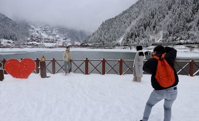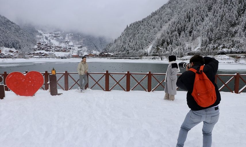 Gece saatlerinde sıcaklık sıfırın altına düşerken, gölün üzerindeki buz yüzeyinin üzerine yağan kar, Uzungöl'ü beyaza bürüdü. Bu doğal güzellikte sakin bir gün geçirmek isteyen ziyaretçiler, buz tutmuş gölün fotoğraflarını çekerek manzarayı izleme fırsatı buldu.