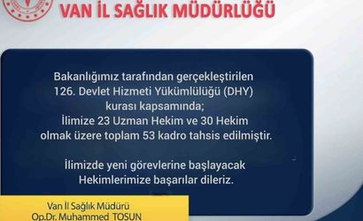 Sağlık Bakanlığı tarafından düzenlenen 126. Dönem Devlet Hizmet Yükümlülüğü (DHY) Kurası kapsamında Van’a 23 uzman hekim ve 30 pratisyen hekim olmak üzere toplam 53 doktor ataması yapıldı.