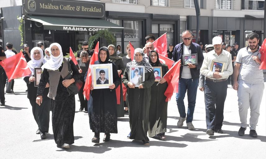 Menekşe Sokak'ta bir araya gelen aileler, Türk bayrakları ve evlatlarının fotoğraflarını taşıyarak, DEM Parti İl Başkanlığı binasının önüne kadar yürüdü.