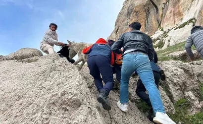 Kısa sürede olay yerine ulaşan ekipler, sarp kayalıkta yürüttükleri çalışma neticesinde mahsur kalan hayvanı bulunduğu yerden güvenli alana indirerek sahibine teslim etti.