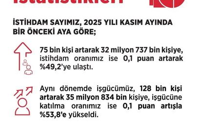 İstihdam sayımız, 2025 yılı Kasım ayında bir önceki aya göre 75 bin kişi artarak 32 milyon 737 bin kişiye, istihdam oranımız ise 0,1 puan artarak yüzde 49,2’ye ulaştı.