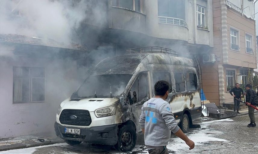 Vezirköprü'de park halindeki minibüs alev aldı; yangın ev ve iş yerine sıçradı