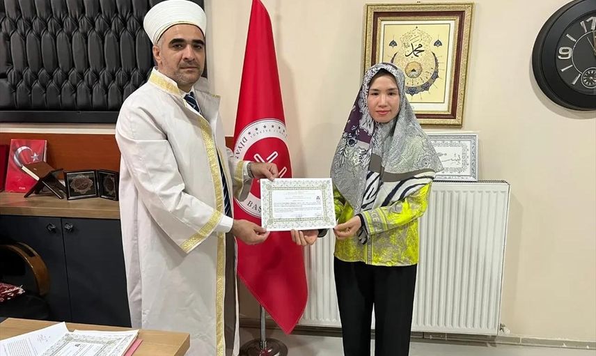 Hakkari'nin Yüksekova ilçesinde düzenlenen merasimle Müslüman olan Vietnamlı Thi Hoa Chau (sağda), "Viyan" ismini aldı. İlçe Müftülüğünde düzenlenen ihtida merasiminde İlçe Müftüsü Mahmut Sevük (solda), Chau'ya İslam'ın inanç, ibadet ve ahlak esasları hakkında bilgi verdi.