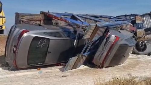 Şanlıurfa'nın Viranşehir ilçesinde 28 K 1994 plakalı tırın devrilmesi sonucu yüklü sıfır otomobiller ciddi hasar gördü; jandarma ve kurtarma ekipleri müdahale etti.
