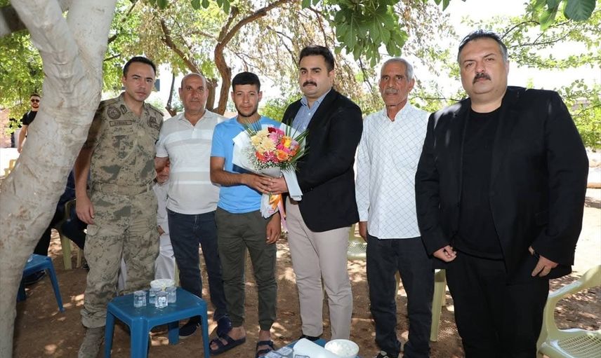 Şanlıurfa'nın Viranşehir ilçesi Kaymakamı Kemal Ülkü (sağ 3), Pençe-Kilit Harekatı bölgesinde metan gazından zehirlenen ve tedavisinin ardından memleketine dönen askeri evinde ziyaret etti. Kaymakam Ülkü, Uzman Çavuş Yılmaz Çiçekler'i (sol 3), Ayaklı Mahallesi'ndeki baba ocağında ziyaret ederek çiçek takdim etti.