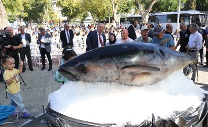 Ege Denizi'nde spor amaçlı balıkçılık yapan itfaiye eri Selçuk Koşar, sosyal medyada kendisinden balık isteyen çocuklara, avladığı yaklaşık 1 ton orkinosu düzenlenen festivalde ikram etti.