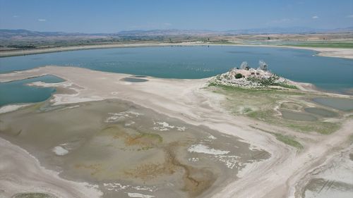Amasya'nın Suluova ilçesindeki Yedikır Baraj Gölü'nde su seviyesi düşerek eski yol ve ada gün yüzüne çıktı.