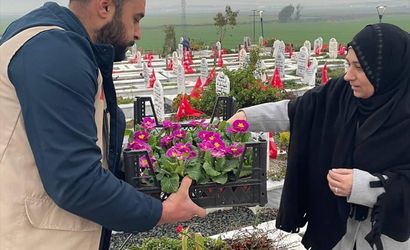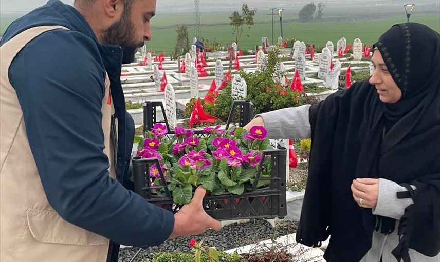 Hatay Deprem Şehitleri Mezarlığı'na da bir ziyaret düzenleyen gönüllüler, burada yaşamlarını yitirenlerin kabirlerine çiçek bırakarak anmalarını gerçekleştirdi.