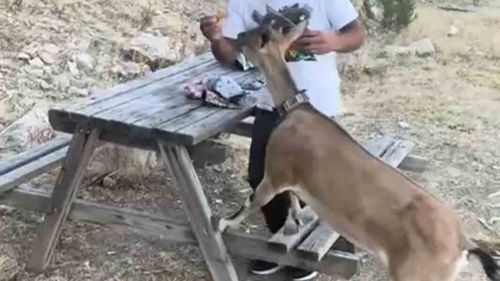 Yozgat Aydıncık Kazankaya Kanyonu'nda Coşkun Uzun, doğada karşılaştığı dağ keçisini elleriyle besledi; anlar arkadaşının cep telefonu kamerasıyla kaydedildi.