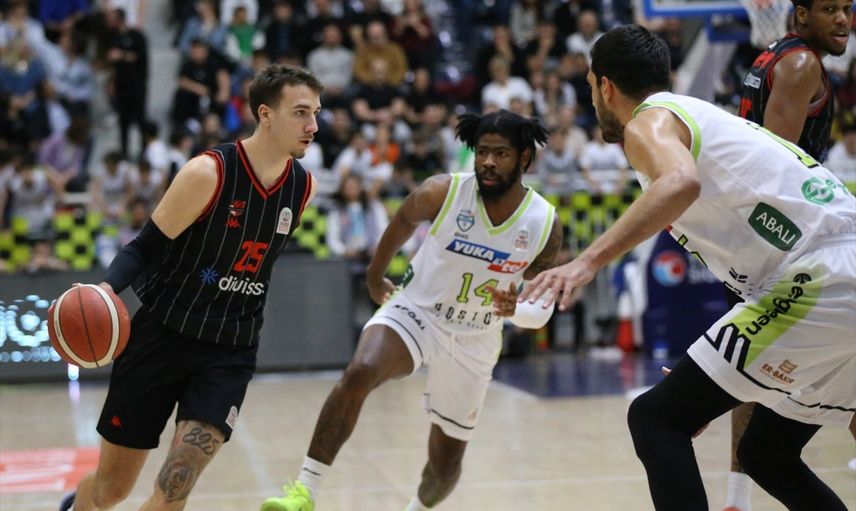 Türkiye Sigorta Basketbol Süper Ligi'nin 25. hafta maçında, Yukatel Merkezefendi Belediyesi Basket ile Manisa Basket Divissa Pamukkale Üniversitesi Spor Salonu'nda karşı karşıya geldi. Bir pozisyonda Manisa Basket Divissa oyuncusu Thomas rakipleriyle mücadele etti.