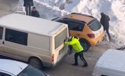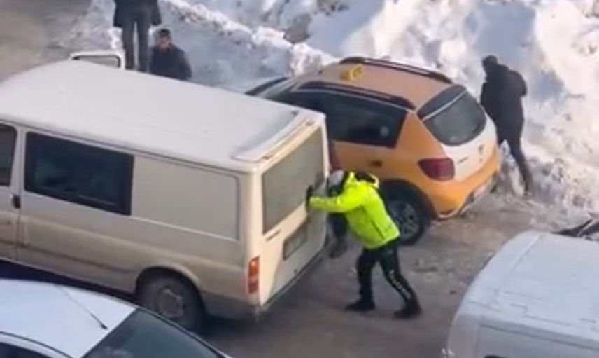 Yüksekova’da buzlu yolda mahsur kalan kamyoneti trafik polisi iterek kurtardı