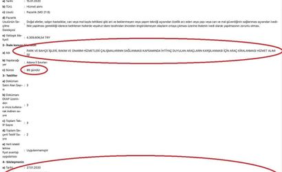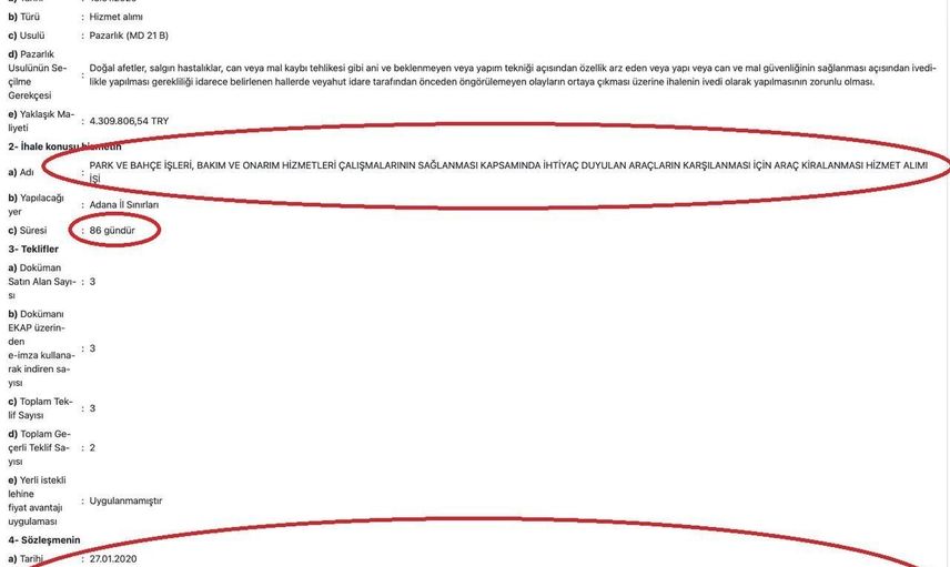 Söz konusu ihalenin, "Park ve bahçe işleri bakım ve onarım hizmetleri çalışmalarının sağlanması kapsamında ihtiyaç duyulan araçların karşılanması için araç kiralanması hizmet alımı işi" olduğu ve 86 günlük süre için 3.985.112 TL bedelle tamamlandığı iddia edildi.