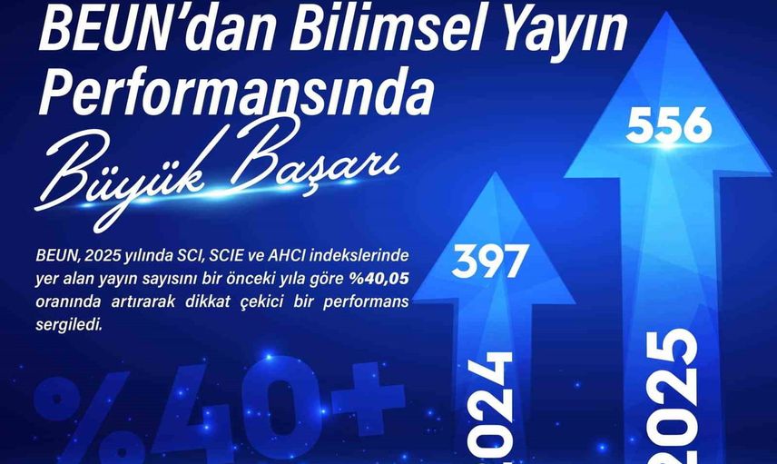 Web of Science’ın 5 Ocak 2026 tarihli verilerine göre, BEUN’un SCI, SCIE ve AHCI kapsamındaki yayın sayısı 2024’te 397 iken 2025’te 556 oldu; bir yıl içinde 159 yayınlık artış ve yüzde 40,05 oranında yükseliş kaydedildi.