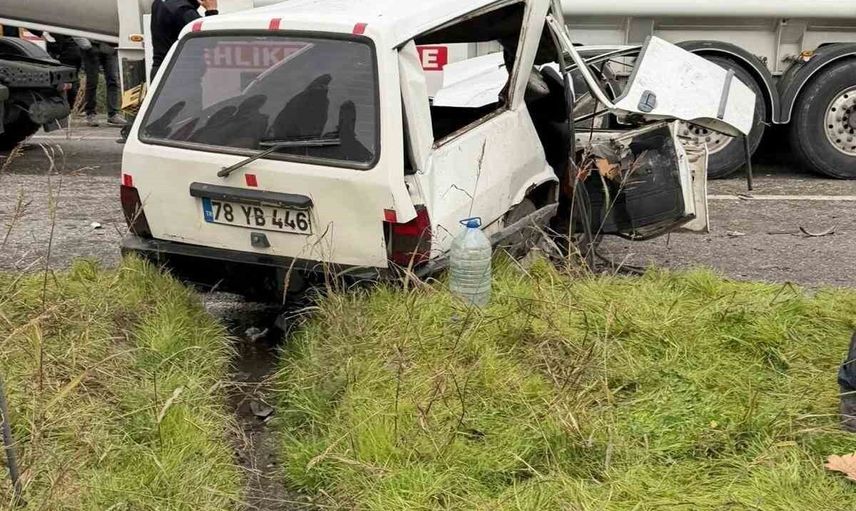 Kazada, otomobili kullanan Volkan Ergin (33) idaresindeki 78 YB 446 plakalı araç, R.A. (56) idaresindeki ve plakası öğrenilemeyen çakıl yüklü kamyona arkadan çarptı. Çarpmanın etkisiyle otomobil ikiye bölündü. Kazayı görenlerin 112 Acil Çağrı Merkezi'ne ihbarı üzerine bölgeye sağlık, jandarma ve itfaiye ekipleri sevk edildi.